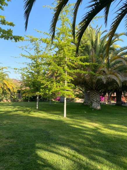 Entorno del centro iluminado destacando los detalles del lugar, casa, árboles del parque, capilla y pesebreras frente a estacionamiento.